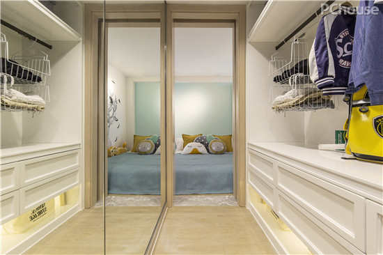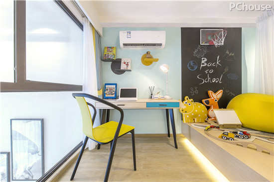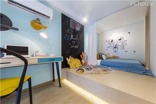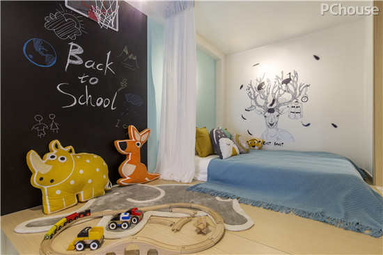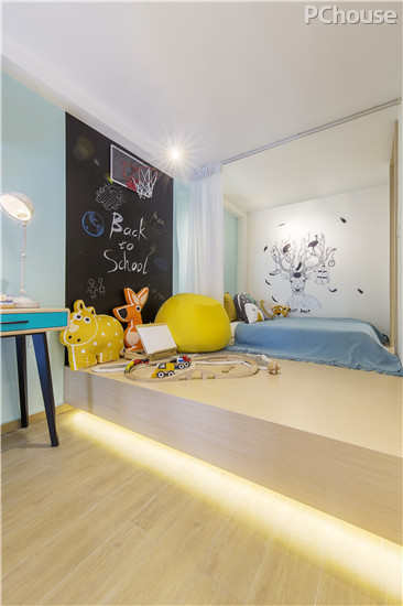 儿童房设为榻榻米形式,设有亲子娱乐区与学习区域,并设有衣帽间,随处摆放的玩偶以及墙上的壁画,让整个房间更像一个童话王国。