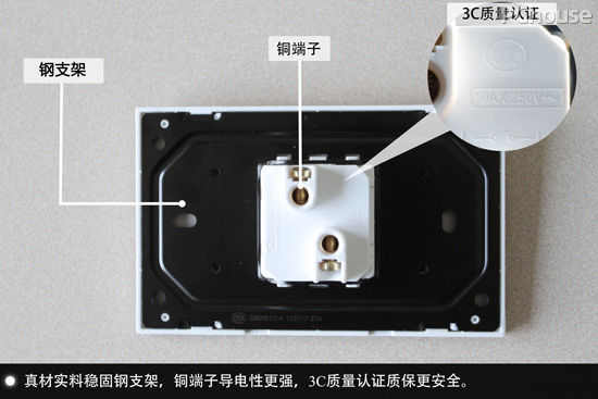 飞雕格爵晶118系列开关插座背部均采用稳固的钢支架,拿起来手感厚重,可以有效防止变型。每个开关插座后背均印有3C的质量安全认证,表明开关插座经过国家安全认证,安全性能有保障。开关插座的连接采用的是铜端子设计,铜端子的导电性能已被行业公认导电性能优越。