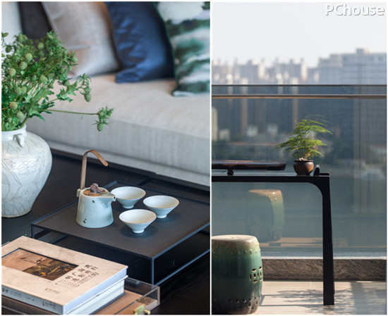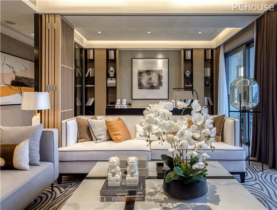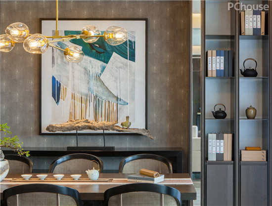 不同灰度的布艺和皮革在陈设上尽情演绎,加以高反光的不锈钢和传统艺术饰品做点缀,使整个空间的材质丰富多彩,时尚文雅又不失个性。