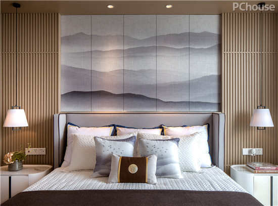 空间以优雅不低调奢华的材质为主,在软装材料的选择上,以有质感的棉麻搭配带有山水元素的丝光布,家具主要以米白色烤漆及深木饰面为主,局部使用玫瑰金、皮革、大理石做点缀,现代东方风情的韵味让人沉醉其中。