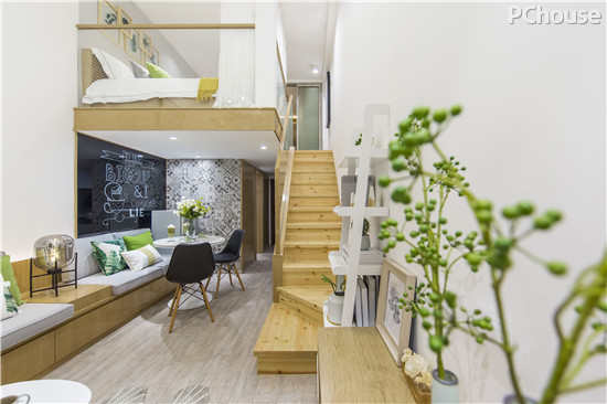 浅咖色的木纹地板与原木色的楼梯以及家具结合,带来自然质朴的气息,让整个房间充满着自由自在的张力。