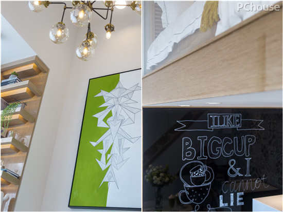 步入阁楼的梯子采用最原始的木色设计,材质上还带有木头的原始斑迹。在这里,设计师把原本枯燥的直线楼梯通过几何形状的切割,形成具有旋梯视觉的楼梯,增加空间的活跃度。