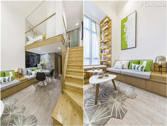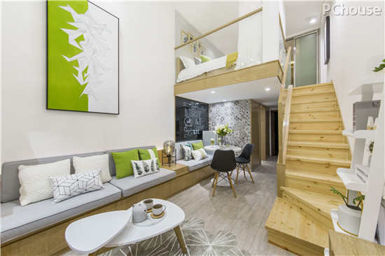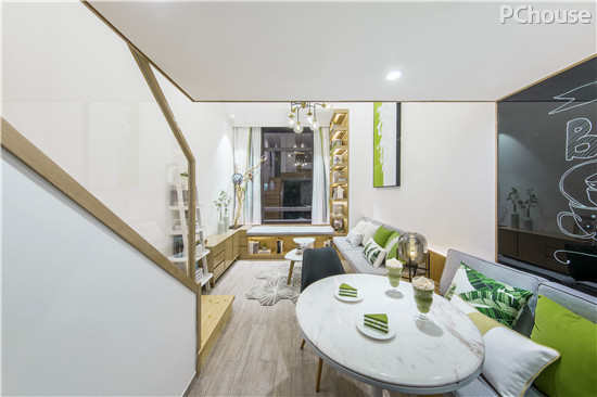 大小两个三角形拼凑出来的茶几,造型独特极具个性,还带有些许北欧风;从楼梯上俯瞰,还可以想象出一个小玩偶的形状。