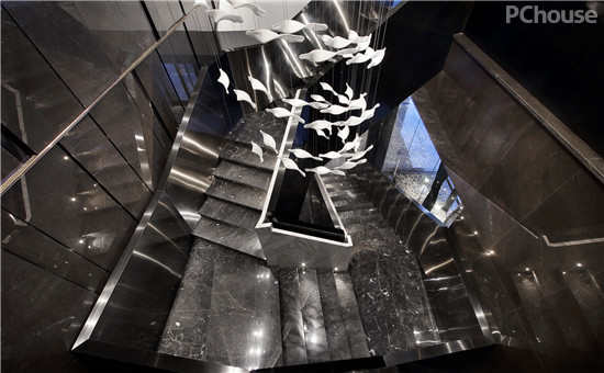 在光影视角下,蜿蜒的楼梯与鱼形意象的吊灯发生化学反应,鱼形装饰在光晕下摇曳生姿,带来不规则的几何美感。