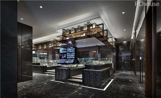 【太平洋家居网 设计频道】本案位于湖南株洲,周边小区密集,交通便利,地理位置优越。在餐厅的塑新装潢中,设计师以渔港为设计灵感来源,将相辅相生的鱼、水定为主题元素,营造出“海天一色、鱼翔海底、游曳自如”的用餐情境,将食客带入一个现代时尚、又不失奢华感的商务酒楼空间。本案运用大理石材料,石材自带光滑流畅的质感,与鱼、水主题元素的调性紧密结合在一起,打造出一个全新的具有流动感的室内空间。