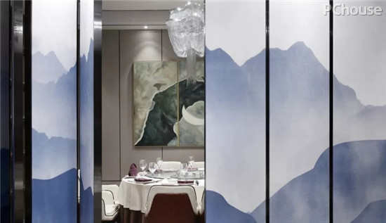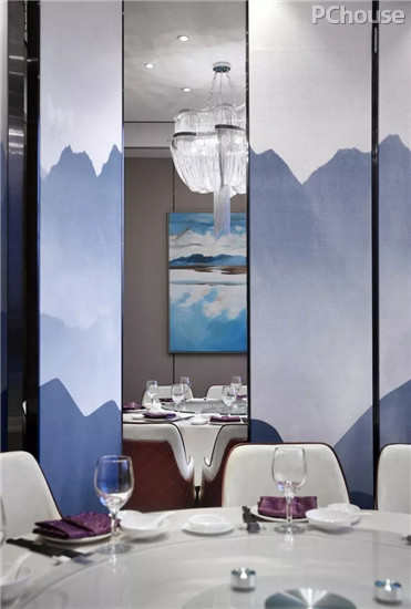 可移动、可打开的包房隔断上绘有连绵不绝的海蓝色山峰,峰与峰相连形成浪的意象,以此为出发点,使既有概念和想象的部分产生对话,让人感受到蓝天碧海相接的意象。包间的吊灯,造型繁复,在光的发散下华丽耀眼。