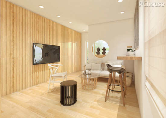 虽然这个空间不大,但沙发、吧台、电视以及展示柜都一应俱全,墙面采用原木黄色,也让空间从视觉上增大不少。同时,设计师出于层高的考量,于是在天花上采用乳白色,产生一种纵深感,让空间不会显得压抑。