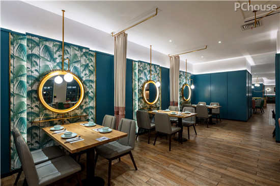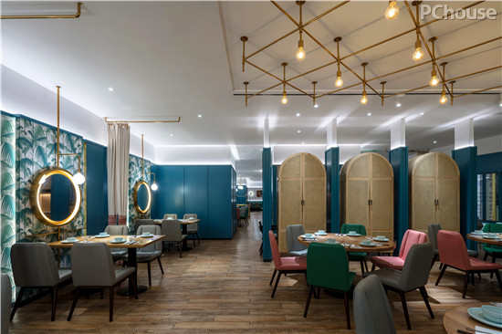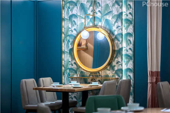 编辑点评:看似平淡的壁纸,其实是有着细腻纹路的设计,就连镜面都有着别致的装饰元素,散发着设计的乐趣。其中性的色调,也在跳跃的蓝绿卡座区中起到了很好的调节作用,有着优雅浪漫的感性气质。