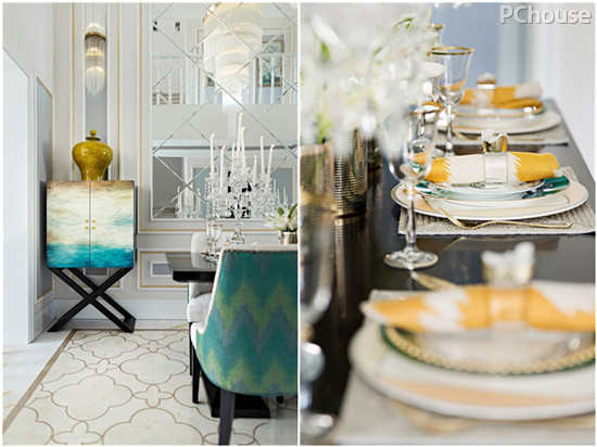 单从布局陈设排列手法上看,体现出了满满的庄重与仪式感。然而餐边柜与餐桌的风格混搭以及颜色的跳跃却为空间增添了一丝活力。
