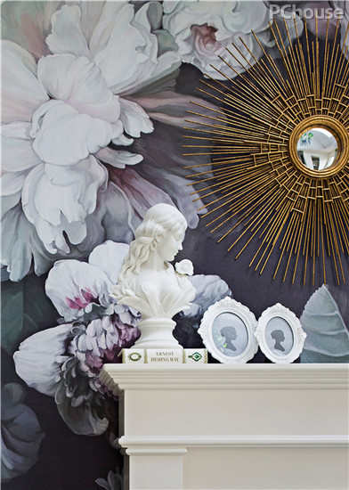 画面中映入眼帘的是主人的起居室,欧式的元素在这一刻显得格外的明显。半遮面的人像挂画、从背景墙落到白色少女肩上的鲜花,都是在以现代的手法致敬着古老的欧式。人生需要有这样一个地方,慢下去、静下来,听花开的声音,品书中的繁华,享受阳光的轻抚。
