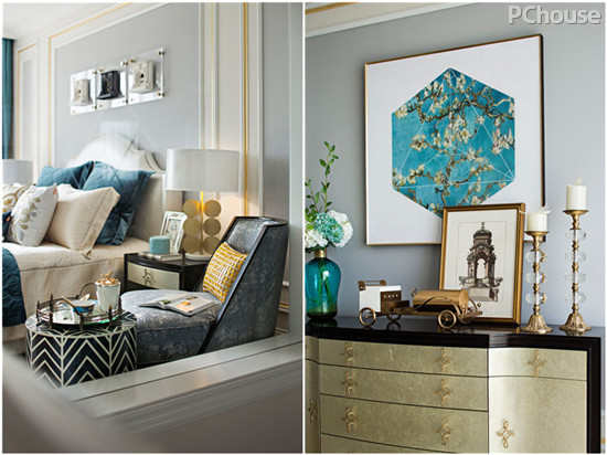 长辈房加入了沉着的蓝色系,花纹与图案也更加柔和淡雅。淡淡的香槟金柜体装饰面,既高雅也显示出父母在主人心中崇高的地位。