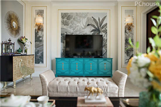 贝壳面的装饰边柜体现出主人的尊贵与品位,在草木绿色主色调的衬托下,花鸟元素在整个空间更是显得活灵活现。