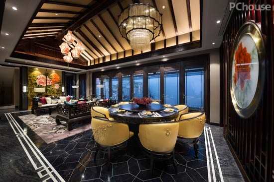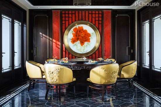 设计说明:现代设计的牡丹花吊灯与背景的牡丹夹绢交相辉映,色彩与厨房的隔断木格屏风形成巧妙联结。红色的树脂墙身传递着中国红的视觉能量,形成独具一格的空间感。与之对应的青花瓷摆件亦增加了空间的收藏历史意味。