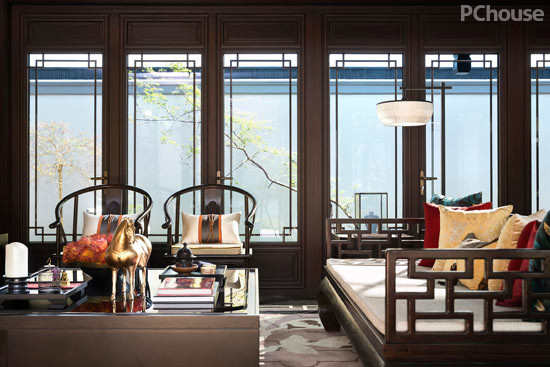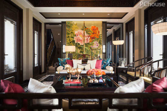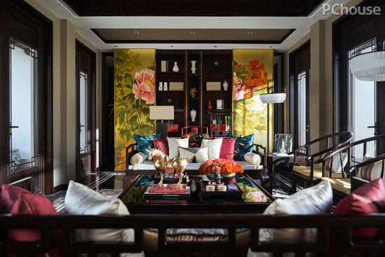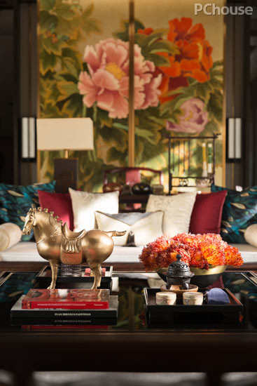 设计说明:空间以米白、浅金与灰色这三种优雅色彩为基调,并用“中国红”来提亮空间。植入传统中式空间“木”,搭配极富手感的丝绸织物与真皮布艺,并缀以“牡丹花图案”于趟门、地毡、抱枕、夹绢玻璃中,藉以点明主题,渲染了一个拟态的“中国士大夫”式自在会客场所。