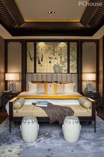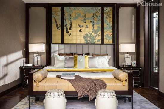 设计说明:以不同灰度相融调节视觉调性,强调舒适感,床头的手绘墙纸再次唱响“牡丹”主题,在中式吊灯的映衬下,盛开得格外艳丽;私密的卧室沿袭了整体空间的清雅与平和,空间色彩、形式,无一不在提示着过去、现在,东方人文的演变与糅合。