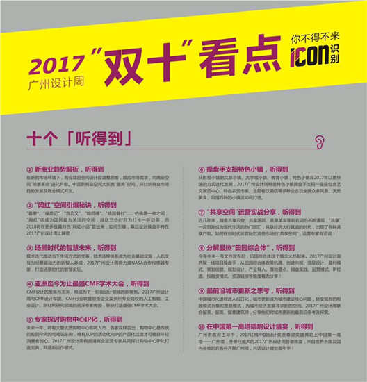 2017广州设计周展会同期活动可谓一场设计产业“全席”,三天展期将举办包括:红棉中国设计奖、中国设计星、40under40中国设计杰出青年、中国城市设计名片、世界青年设计师论坛(WYDF)、国际设计论坛(IDF)、设计源·世界观、中国新商业和旅游地产设计年会、国际色彩设计大会(ICS)、国际CMF设计大会、N3领袖论坛、环球游学之旅、中国新商业空间大奖(NCDA)、德国ICONIC AWARDS标志性设计奖、好好生活等广州设计周旗下项目年度盛典在内的,近100场涵盖“艺术、设计、时尚、地产、新商业、生活美学、人工智能”等领域的主题活动,汇聚逾200位国内外设计产业相关领域的资深专家、意见领袖,通过不同视角研讨、辨析设计价值的革命性进阶及探讨新环境下的产业态势……让您三天听到嗨!