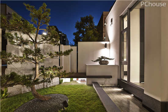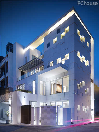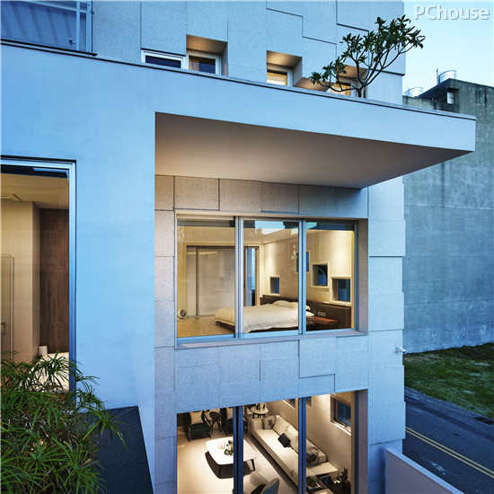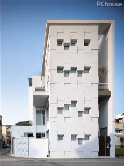 【太平洋家居网 设计频道】伫立在街角的房子,希望它成为一座雕塑品。此案,从建筑外观,庭园设计,到室内设计,业主全然信任与委托,这对设计者而言是一件充满感恩的事情。在配置上,将生活机能垂直整合于基地东侧,使西侧的建筑外观有条件可以呈现建筑的层次。而窗户的开口成了这栋建筑的音符,将白色的花岗石尺寸调整同于窗户尺寸,一片一片不同的厚度吊挂于外墙结构,白天安静地伫立着;待夜晚来临时,透光的开口,使雕塑的建筑赋予不同的生命。