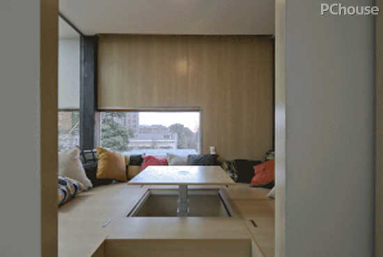 将卧室的床收起,方向翻折长条桌,形成缪庆个人的把办公空间。榻榻米中心的木板,向上升起,成为团队头脑风暴的场所。