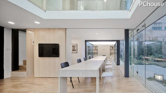 自由移动的隔墙,分割出会客空间和办公空间。拉伸出外墙体块,结合2m变20m的超长桌子,将餐厅变身为workshop。