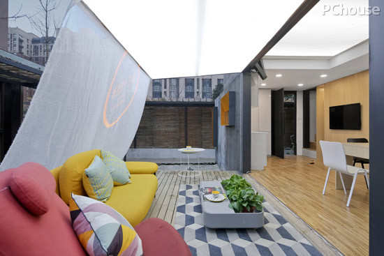 向外翻起的墙体,形成了室外的一个灰空间会客厅。