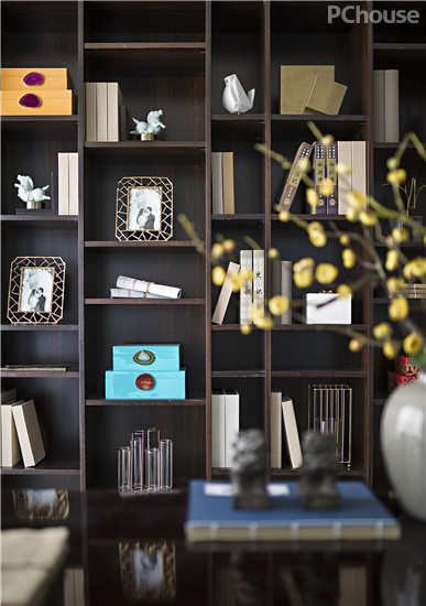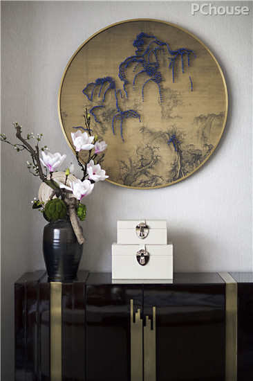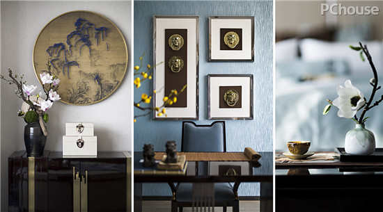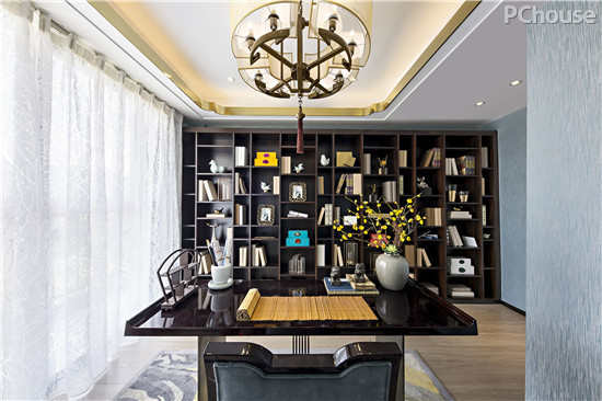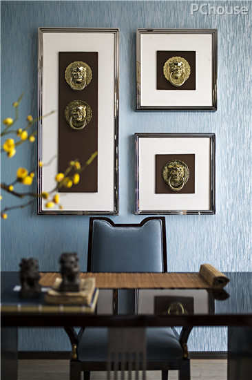 满腹经纶、一纸书香,提到文人我们总会有这样的印象,书房设计最能体现人的精神世界。一个简约大气、古色古香的书架占据了书房入口右侧的整面墙壁,沉稳的深木色,沉淀的优雅。简化改良版的中式书桌椅,散发着清雅气质之美,背后的组合装饰画更是别出心裁,画中的兽首门环,商周铜饰中早已有之。