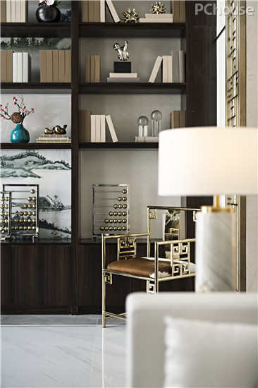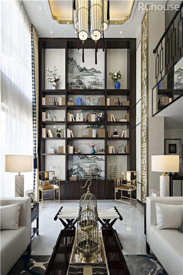 清雅的软装配色、木制长几及流苏吊灯,尽是古意。空间入口两侧以金色的传统格纹装饰镶裹,与二楼的黑色扶栏呼应,大气雅致,独具传统情调。客厅另一侧是高至天花的大型书架,山水墨色藏于其间,营造出怀抱清旷,幽深雅致的空间氛围。