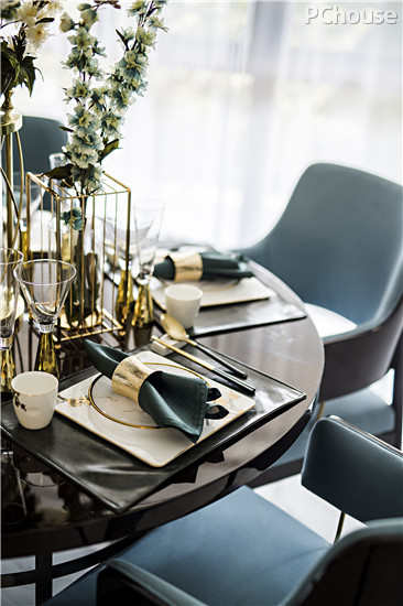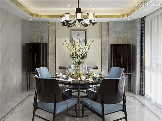 餐厅设计现代而不失整体的中式韵味,传统的对称布局严谨合度。在材质的选择上适当加入玻璃和金属等现代的装饰材料,样式新颖的餐椅和酒柜在细节处糅合了宋代家具设计美学。西式餐具于优雅里凸显庄重自得的心态,清新花艺营造出馨香深远沁人心脾的就餐氛围。