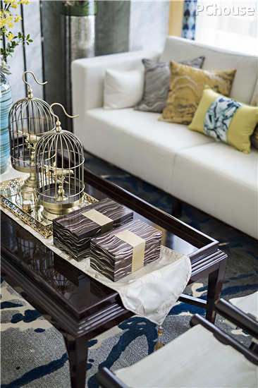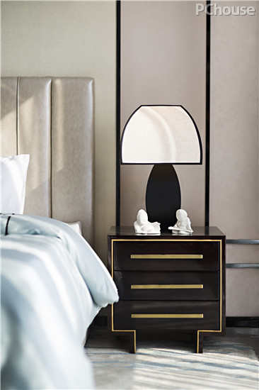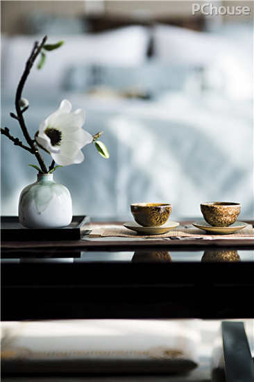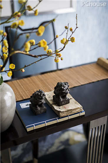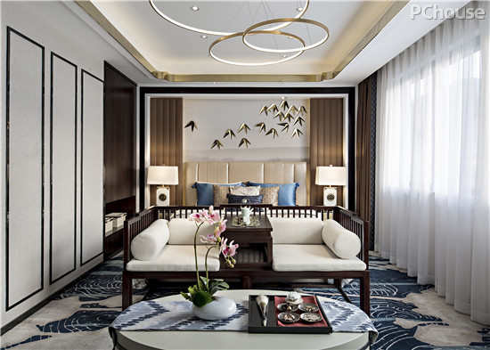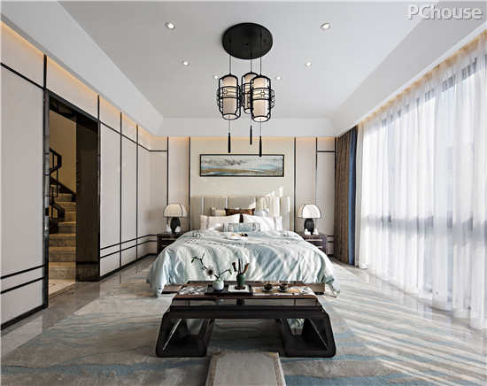 次卧设计以清浅的水蓝色为主调,同色系的水流纹地毯、山水挂画,于虚静中赋予空间灵动气韵。古雅的流苏吊灯与壁柜的黑色线条呼应,委婉清秀。黑色的传统案几,将谦和与宁谧的心境定格。