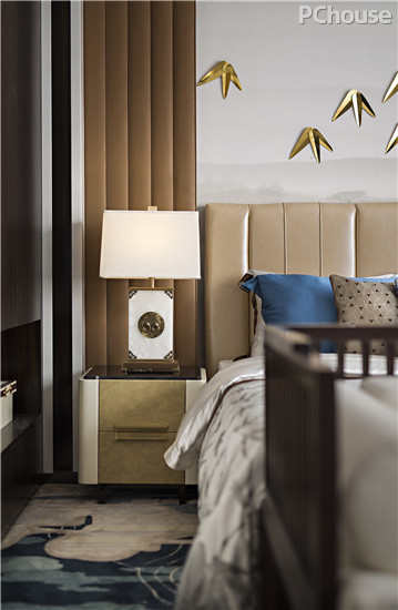 主卧套房位于安静的五楼,散发着传统意味的花纹地毯铺陈于整个空间。床位的背景墙像一幅向两侧缓缓展开的山水画卷,清浅、氤氲,韵味悠长,金色的竹叶装点其间,将文人的“如竹之虚,如斯之雅”的君子风度淡然书写。