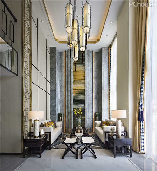 客厅空间挑高设计,纵向格局,磊落翩然,特别是碧玉大理石装饰墙,温润清通,彰显“谈笑有鸿儒,往来无白丁”的儒雅风范。