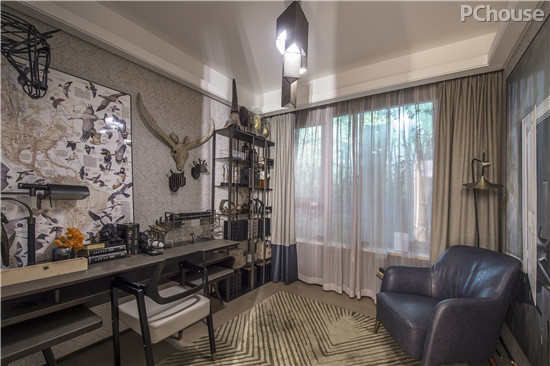 书房设计,无声无息的体现一种淡淡的怀旧与后现代的趣味盎然。空间打破复古与时尚、嘻哈与庄重、繁复与简洁之间的界限,混合了不同时空、文化、风格的元素,因各式动物标本模型而更富有神秘传奇味道。