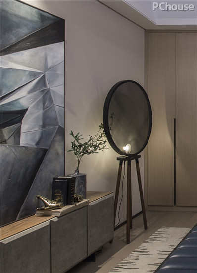 床头背景墙的墙纸,轻微闪动丝丝光泽,纵向线条交织,打破了硬装的平铺直叙,圆形落地灯如一轮清静圆月,将月色的澄清、静谧带到室内空间,赋予空间后现代的诗意。