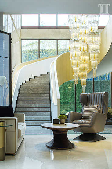 自带光束的转角楼梯,踏着星空灰的台阶,直通未来。那高空缓缓垂下的帷幔灯饰,如晶莹的荧光划破时空,定格了优雅光影中的小世界,显得恬静、悠闲。