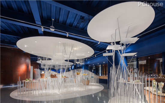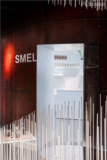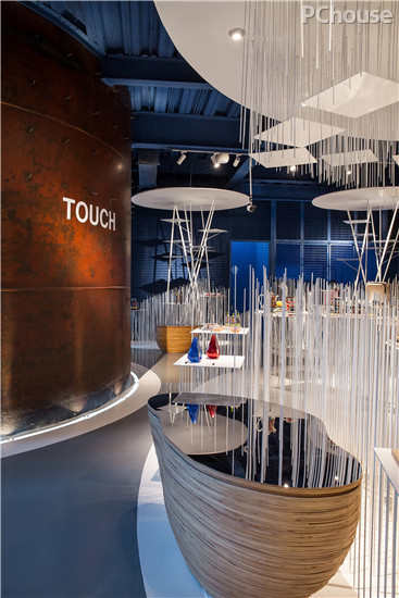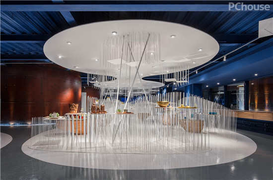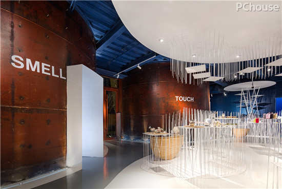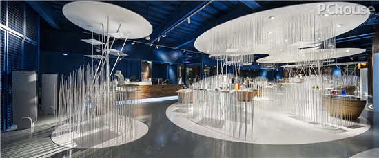 色彩则是人体对空间感觉的触发器,纯白色的中心区域则是整个展示的核心轴,与周围压暗的宝湖蓝有着质感的对比,并将走进空间的人流被强烈视觉吸引到这里后,再由VI导视引导发散于各个大罐子。