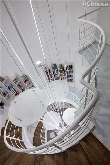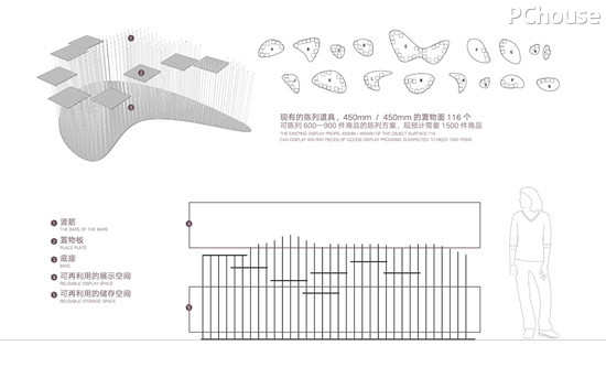 数据统计,原装置的摆放率只有600件,面临后期大量的设计师产品展示需求,它的功能是远远不够的。设计师将其中一些装置进行倒置并加以链接,不仅解决了拉近大层高的空间高度,同时上与下的关系与材质使这些区域形成独立的空间。