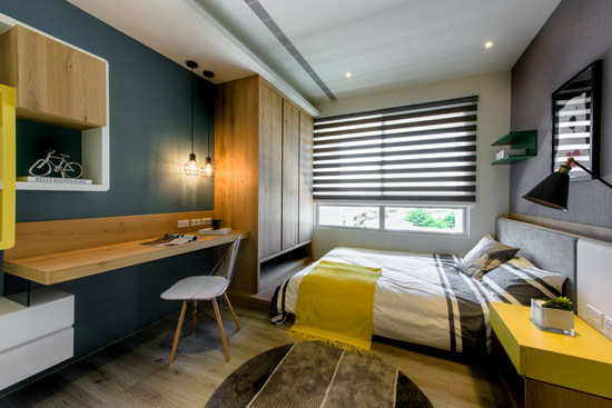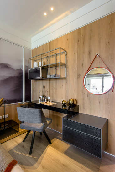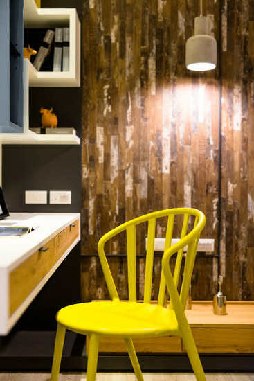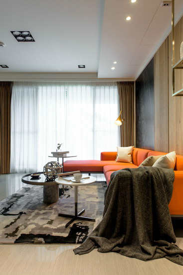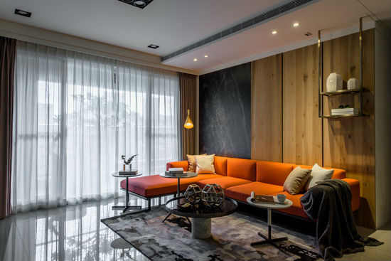 强烈的色调可以赋与空间整体性与个人特色。这鲜明的色调能调和空间的冷调与理性特质,再加上轻柔垂墬感的窗帘,为整体设计增添一些舒适与柔软的视觉焦点。木头壁墙当作视觉框架,柔化线条的刚硬度,为空间塑造清新的风格,赋予这简约及未来派风格更多感性的人味。橙色又称橘色,是黄色与红色的混和色,所以同时具有红色的能量与黄色散发光芒的特质,容易被人接受。橙色在空气中的穿透力仅次于红色,色感较红色温暖,是所有色彩中最温暖的颜色,令人联想到节庆、丰收的秋天,光辉的太阳,是富足幸福快乐的颜色。