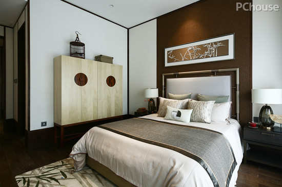 老人房,设计师将代表中国雅士的竹文化自然注入空间,“如竹之虚,如斯之雅”的君子风度淡然书写。竹子元素的刚毅挺拔,与地毯、挂画、抱枕等相互照应,寓意父母青春常驻。