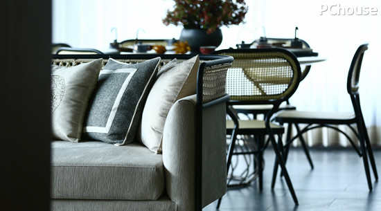 低调的色彩,不追求绚丽斑斓;自然的感觉,却自有一番体验。家具选材考究,黑色哑光不锈钢的硬朗,与天然藤编的柔美,刚柔相济,是矛盾,更是和谐。水墨画、花艺、瓷器无不在彰显“谈笑有鸿儒,往来无白丁”的儒雅风范。