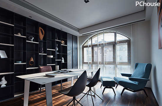 经典、神秘、霸气,铸就了高级黑永垂不朽的神话。书架统一使用黑色,成熟稳重而又不失惊艳韵味,近似没有温度的外表下隐藏着炽热的内心。轻薄的钢板边缘,就像横纵交错的线条,只一眼,便能让你无可救药地沦陷。设计师有意将书房的一堵墙换成玻璃与钢的结合,室外的光在走廊、楼梯间“放肆”地流窜,略有几分“凿壁偷光”的意思。