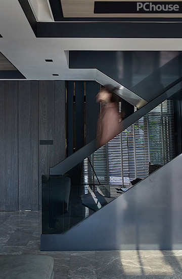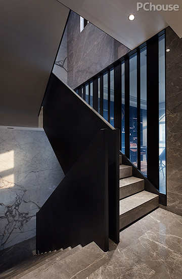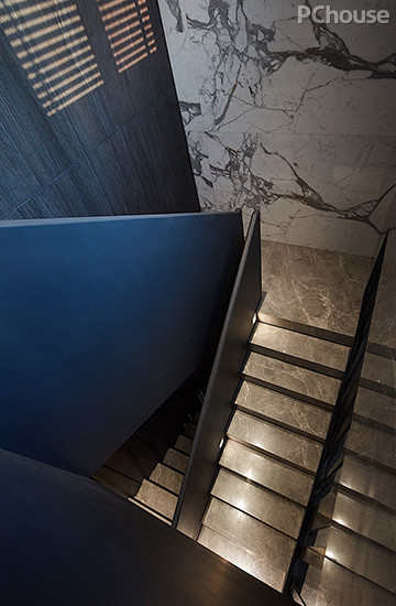 楼梯摒弃传统的处理手法,扶手采用简洁的灰蓝色钢,沉稳而内敛,与主人的严谨作风相辅相成。大块面的石材贯穿三层,空间的延续性得到很好地保证。从高处俯瞰下方,整个空间既像一个厚实的臂膀,又似一处港湾,心灵得到栖息。