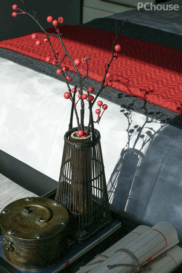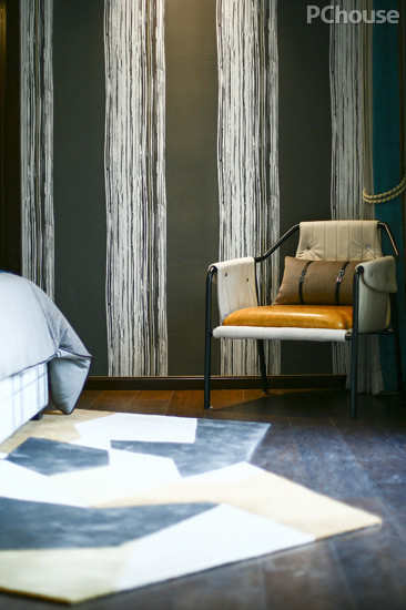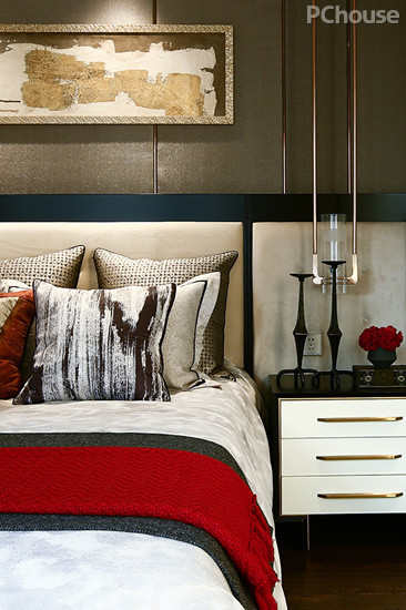 主卧,则尽显诗画之美感。中国五行,红色为火,黑色为水,故宫红搭配经典黑“水火相济”,写意东方也寓意尊贵。大靠背的双人床与左右对称的吊灯和谐统一,凸显庄重的生活仪式感。床头柜上的老物件与当代胡桃木作家具在传统与现代间达到了平衡。