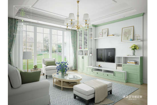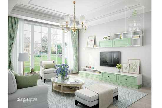 清新自然的绿色让客厅空间有着一种春意盎然的生机,多元的软饰与摆件装饰,又赋予了空间的整体以时尚的气息,有着优雅与清新的双重气质。索菲亚空灵-蔓系列的吊柜与电视柜组合,为空间的有序整合提供了基础的条件,同时也从色彩上达到整体协调与活力的效果,展现了一个舒适自由的客厅空间。
