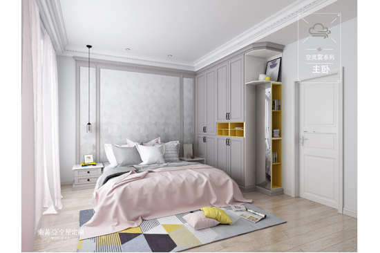 到顶的U型衣柜一来可以延伸空间感,二则可去掉由于各种繁冗而造成的空间浪费,非常适用于中小户型空间。浅灰色空灵雾系列更是有着高雅的质感,将简洁的风格发挥到极致。