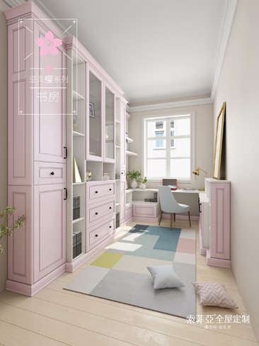描述索菲亚-空灵“樱”系列书房的初见印象,映入脑海的便是‘春光无限’。在简约而留白的基础上加入粉色调的书柜组合,这样的搭配新颖而梦幻,让人不自觉地将其与温暖幸福划上等号。