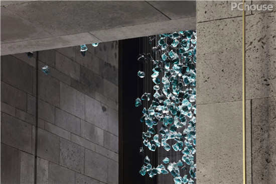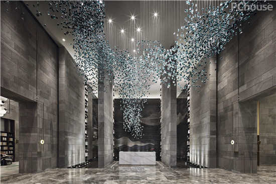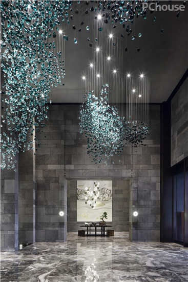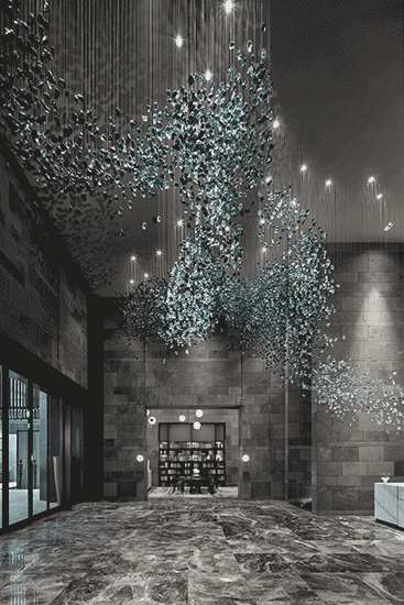 接待台背后搭建出向下流动的水景幕墙,U型水景区设计取义重庆特有的两江汇流的地理特征。大型艺术装置“峰起”描绘的则是群山的意象,蓝绿色琉璃质地在灯下熠熠闪光,有步移景异之感。