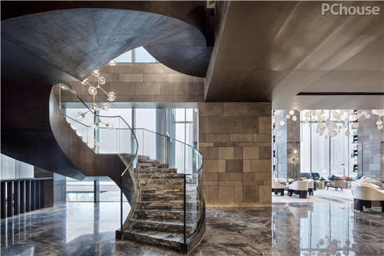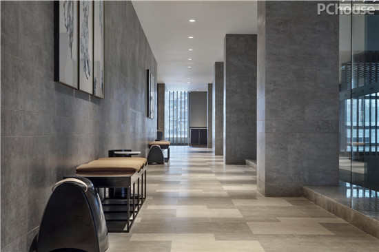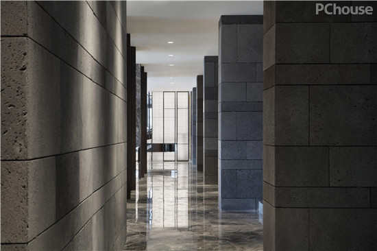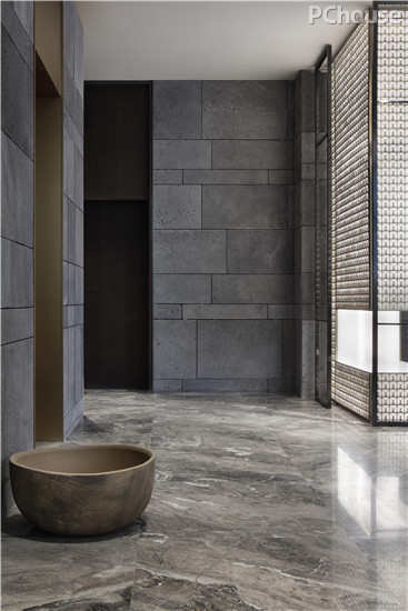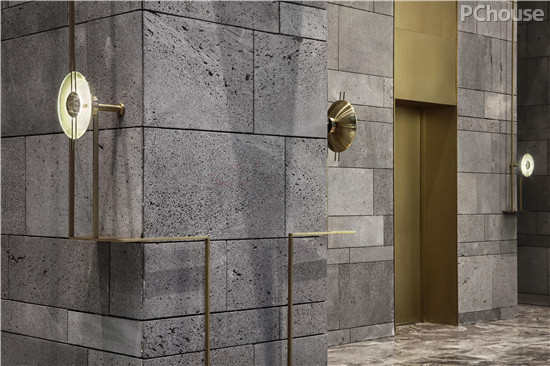 步入前厅,便是一个三层挑高的大空间,开阔挺拔。内墙由不同灰度的火山岩拼合组成,带有天然孔隙的火山岩色泽沉着厚重,披满故事。水波纹一般的大理石地面则更具有摩登感。