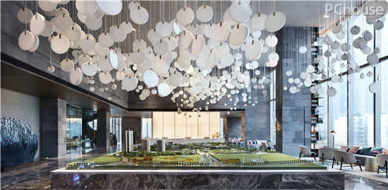 乘坐电梯往上,来到半山接待区,设计师以简练的笔法,通过开阔的空间尺度,营造“SKYLOBBY”的理念。
