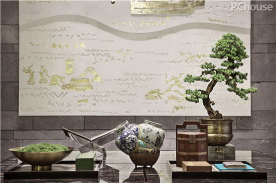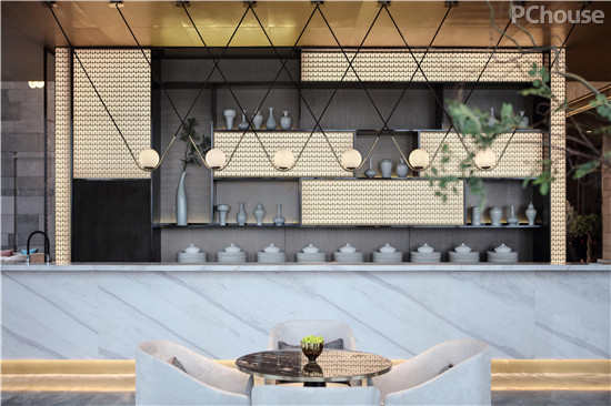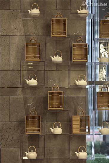 设计师采用现代的手法展现巴渝舞图、建都巴积图、巴乡酿酒图等古老的巴渝文化图景,将低矮方正的家具与盆景相结合,传达东方审美,同时在墙面运用鸟笼与茶壶来展现重庆人饮茶与休闲的生活方式。