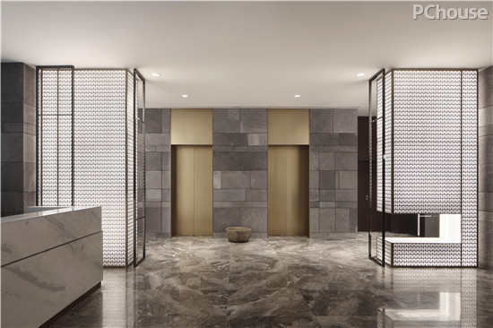 前厅的右侧是雅致古朴的电梯厅,墙面展现的巴渝文化装置、石雕如同历史的一面镜子,折射出过去与未来。