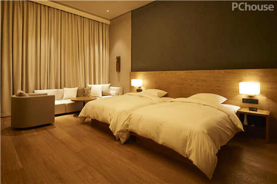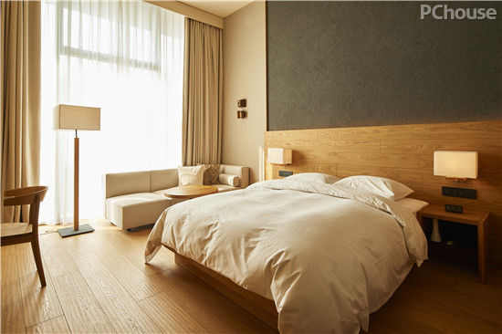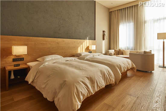 在客房打造过程中,整体色彩以灰色、米色和原木色来铺垫。墙面含有活性炭的米色、灰色硅藻泥用作墙面材料,使其能够自动调节房间湿度,同时帮助客人促进健康睡眠。